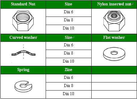 Standard bolt: Material: carbon steel , zinc plate Grade: 4.8 grade Note: per set bolt include as the following , Bolt , Washer (flat or curve) , Spring+ , Hexagon nut (standard or with nylon inserted nut)